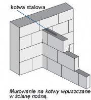 Szczególnej uwagi wymaga łączenie ścian wewnętrznych konstrukcyjnych z zewnętrznymi. Musi być ono wykonane w sposób, który gwarantuje przekazywanie pomiędzy nimi obciążeń pionowych i poziomych. Jest to możliwe dzięki wiązaniu elementów murowych lub stosowaniu metalowych łączników, bądź zbrojenia przechodzącego w każdą ze ścian. Przy czym konieczne jest, aby obie ściany były wznoszone (i łączone ze sobą) równocześnie.
